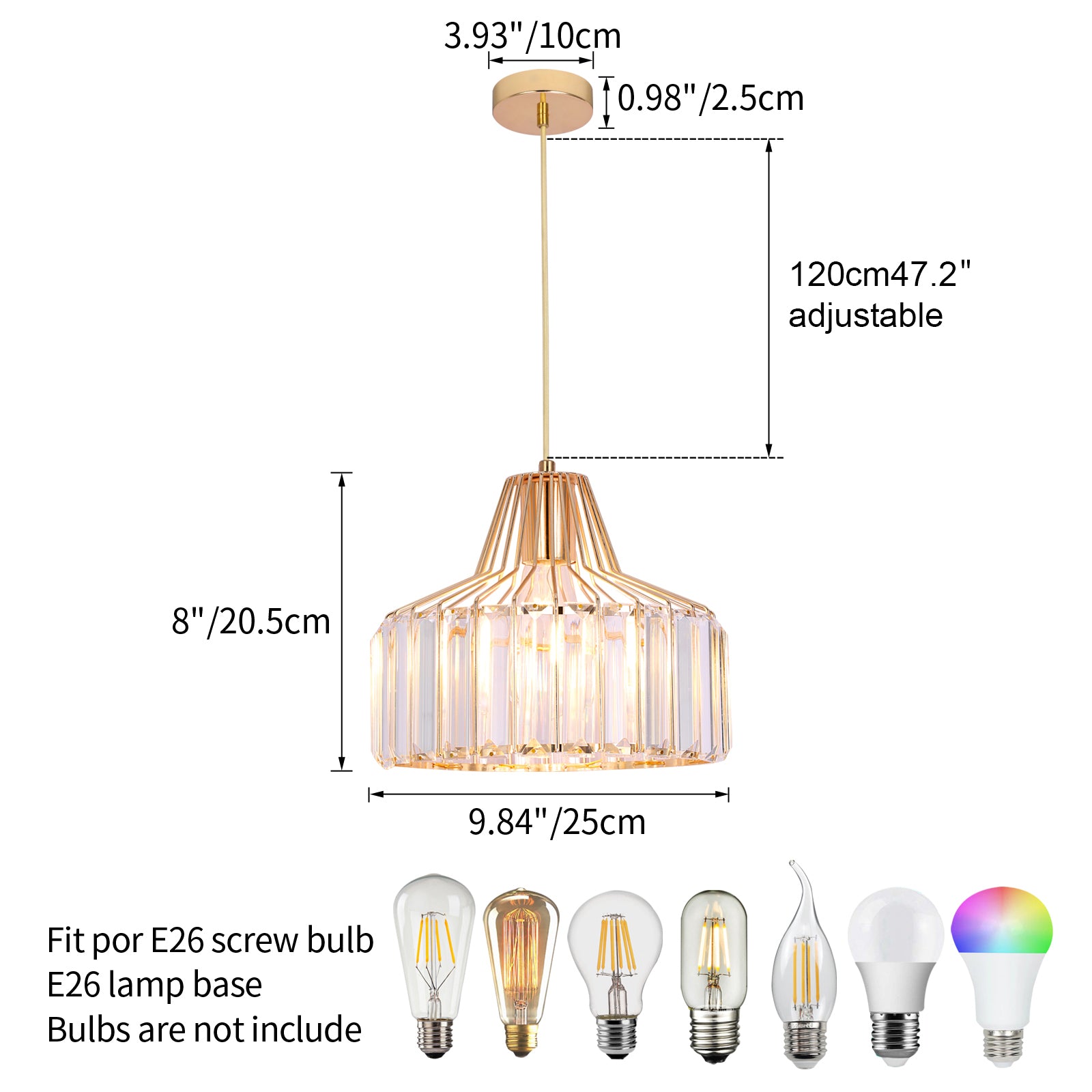 Add a touch of elegance and luxury to your space with this stunning gold and crystal pendant light. Designed with high-quality iron and sparkling crystal accents, this chandelier-style pendant light is perfect for living rooms, dining areas, bedrooms, and entryways. The gold finish enhances its sophisticated look, making it a perfect addition to both modern and classic interiors. Compatible with E26/E27 bulbs (bulb not included), it provides customizable lighting to match your ambiance.