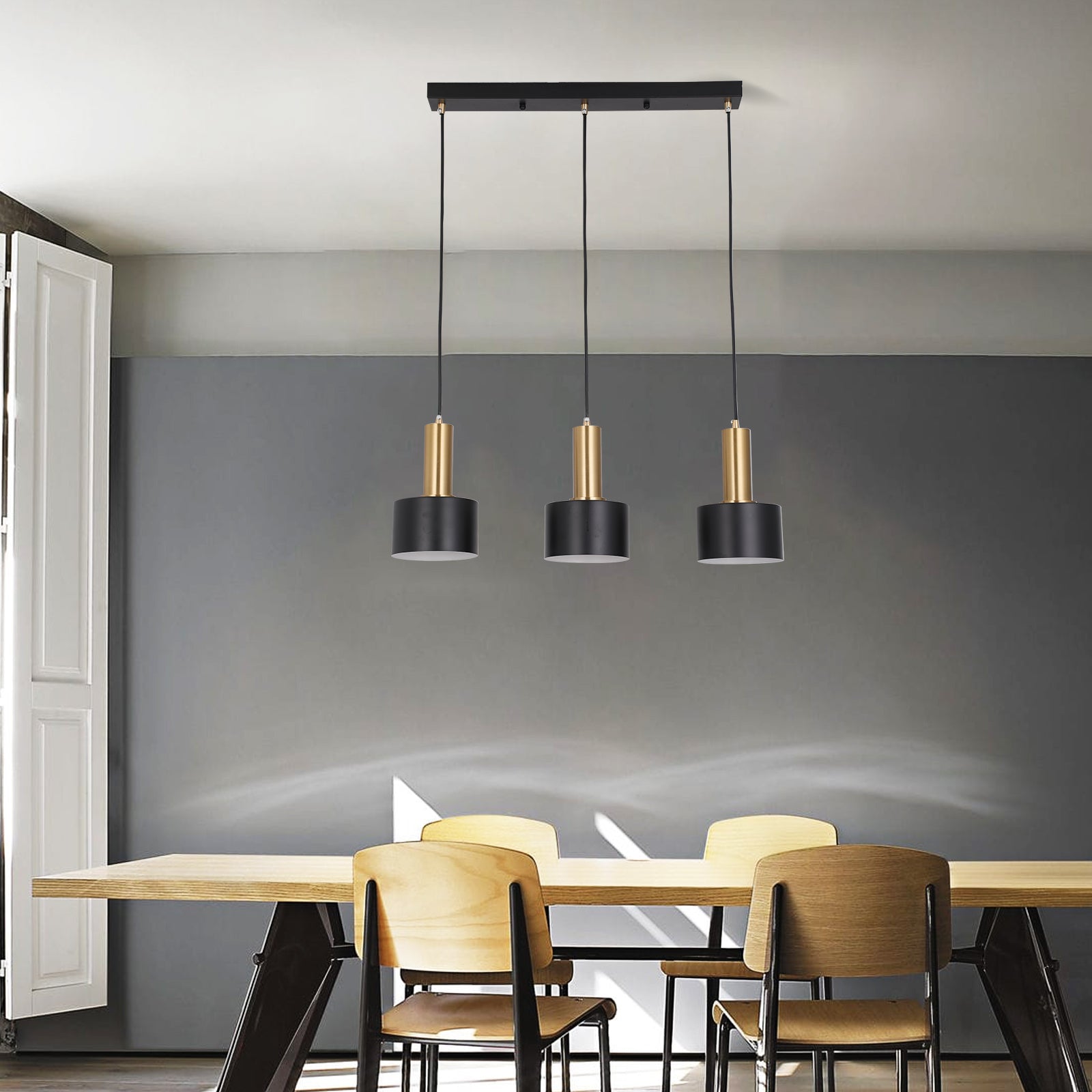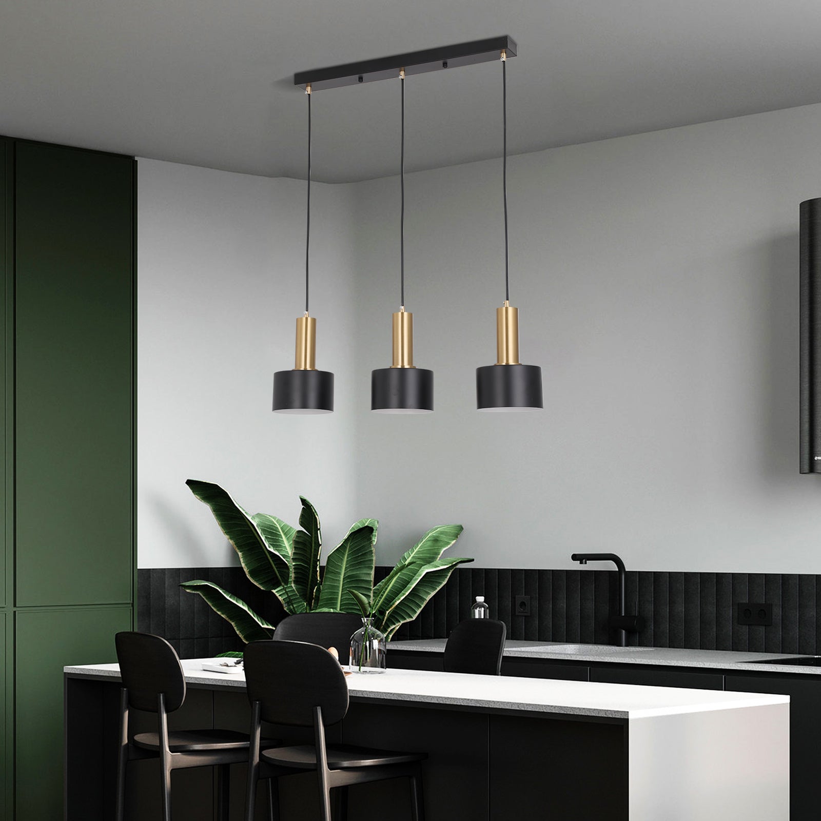 Elevate your space with this sleek and modern 3‑light pendant lamp. Featuring a gold and black iron body, this stylish fixture adds a touch of elegance to kitchens, dining areas, and living rooms. Designed for E26/E27 bulbs (bulbs not included), it provides customizable lighting to suit your ambiance. The linear design makes it a perfect choice for kitchen islands, dining tables, or bar areas.